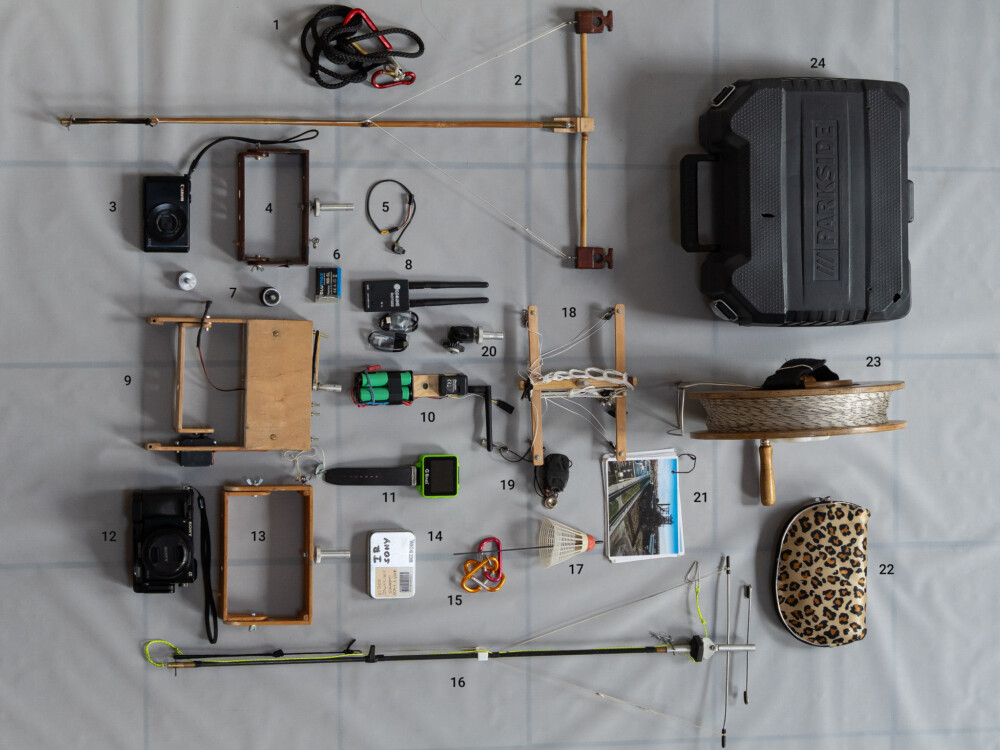 Neben den Drachen benötige ich für meine Luftbildaufnahmen allerlei Zubehör, welches auf dem Foto zu sehen ist und welches ich weiter unten näher beschreiben werde .